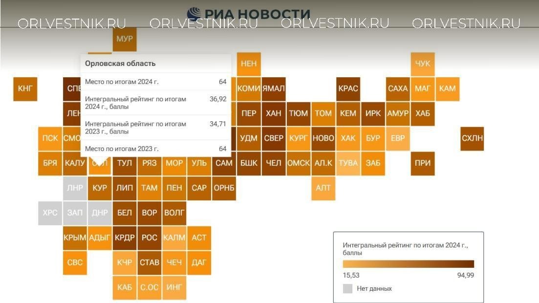 В рейтинге развития российских регионов Орловская область по итогам прошлого года, как и в 2023, заняла 64 место.