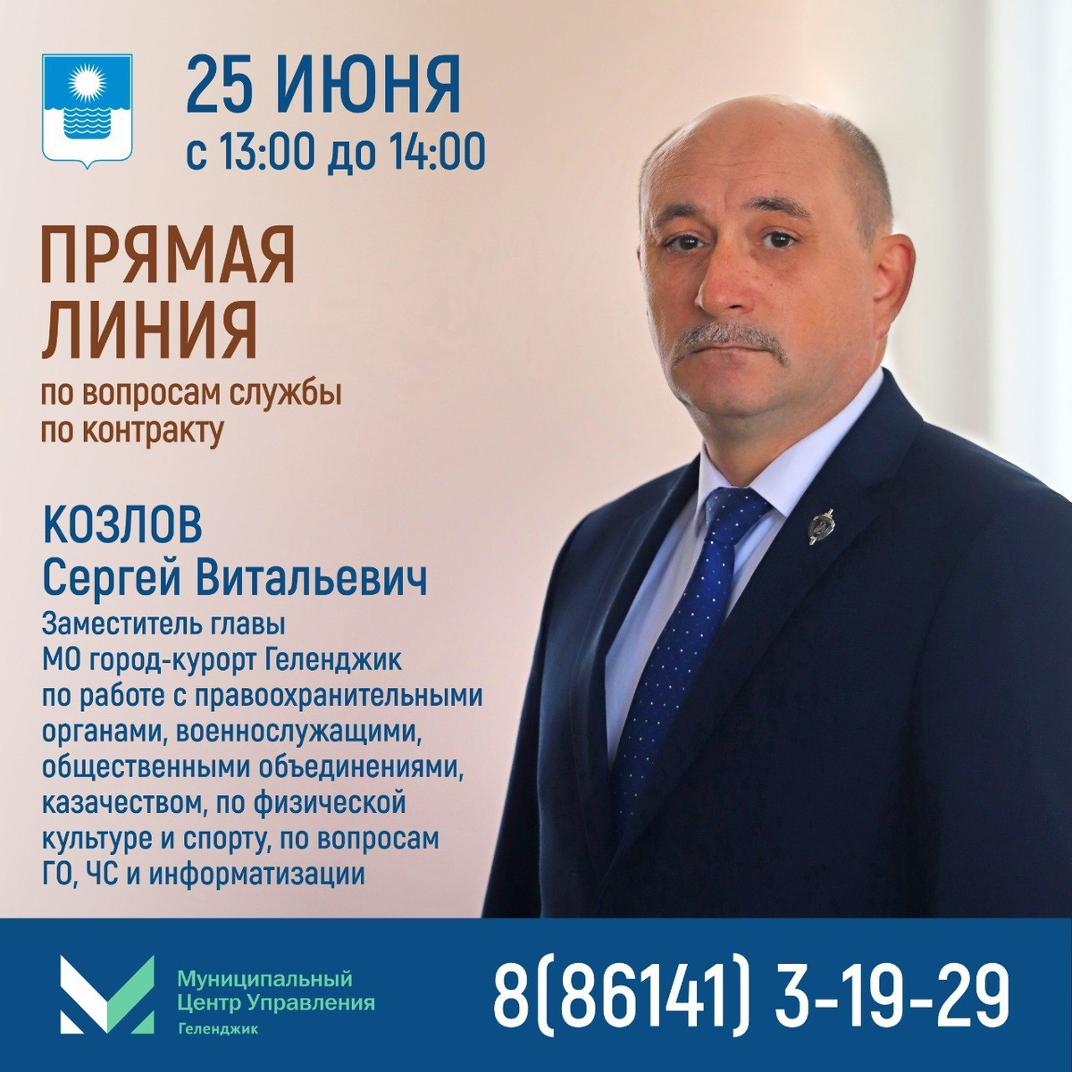 25 июня, с 13:00 до 14:00, на базе Муниципального центра управления, состоится «Прямая линия» по вопросам, касающимся прохождения военной службы по контракту. Жители города смогут адресовать свои вопросы заместителю главы муниципального образования город-курорт Геленджик, Сергею Витальевичу Козлову. Приглашаем всех желающих принять участие в диалоге. Для участия звоните по телефону: +7(86141)3-19-29. Также всю подробную информацию по вопросам заключения контракта на прохождение военной службы можно получить в военкомате Геленджика по адресу: ул. Ленина, 34 и по телефонам: +7(900)243-55-11, +7(86141)3-30-77, +7(86141)3-18-32.