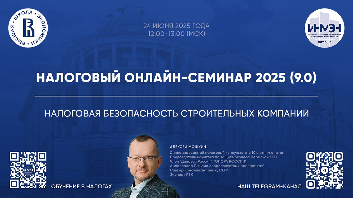 📅 24 июня | 12:00 МСК 📍 Онлайн | Участие бесплатное 🏗 Тема: Налоговая безопасность строительных компаний Строительный бизнес — один из самых привлекательных и одновременно уязвимых для налогового контроля. ФНС внимательно следит за сомнительными контрагентами, дроблением, серыми зарплатами и многим другим. Любая ваша ошибка может привести к крупным доначислениям и штрафам. На вебинаре разберемся: ✅ Как устроена логика налоговых проверок в строительстве ✅ Что привлекает повышенное внимание проверяющих ✅ Как налоговики доказывают уход от уплаты налогов ✅ Как грамотно отбиваться от претензий ФНС ✅ Как выстроить безопасную модель и снизить риски ✅ Что делать, если вы получили "черную метку" от налоговой. 🎤 Формат — прямой эфир, с разборами кейсов из моей практики и судебных дел. Без «воды» и лишней теории — только то, что действительно полезно. Будет возможность задать свои вопросы — с удовольствием на них отвечу. 📎 Вебинар организован для слушателей Высшей школы эконом