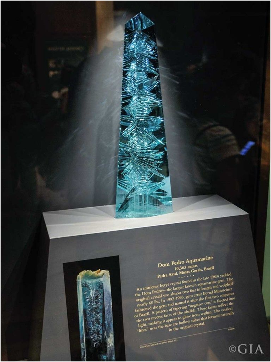 Аквамарин «Дом Педру» [Dom Pedro] – самый крупный в мире ограненный аквамарин. Он был огранен из кристалла, изначально весившего около 60 фунтов (27 кг) и имевшего длину почти 2 фута (0,61 м). Камень был добыт в Педра-Азул в штате Минас-Жерайс в Бразилии примерно в 1980 г. и назван в честь бразильских императоров Педру I и Педру II. Сине-зеленый драгоценный камень был огранен Берндом Мунштайнером в форме обелиска весом 10363 карата. Это примерно столько же, сколько весит штанга, почти пять фунтов. Его окончательные размеры составляют 14 дюймов (36 см) в высоту и 4 дюйма (10 см) в ширину. Драгоценность в 2012 г. была подарена Смитсоновскому институту парой коллекционеров из Палм-Бич, штат Флорида, Джейн Митчелл и Джеффри Блэндом. Она хранится в зале геологии Джанет Анненберг Хукер.