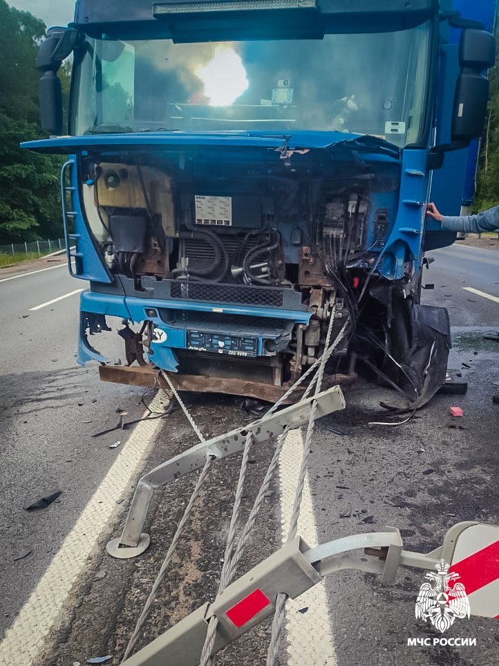 ❗Сегодня в девятом часу утра на трассе М-1, в районе деревни Мушковичи Ярцевского муниципального округа, грузовой автомобиль совершил столкновение с тросовым дорожным ограждением. В результате удара был повреждён топливный бак.