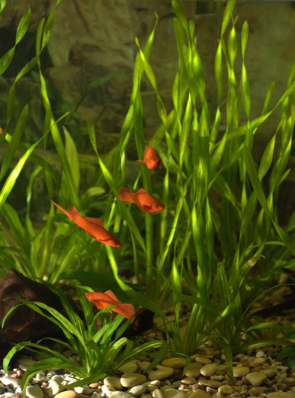 Итак, в зависимости от объёма аквариума, к меченосцам можно высадить растения переднего, среднего и заднего планов. Для оформления переднего плана отлично подойдут почвопокровники марсилия, элеохарис, лилеопсис и многие другие. Для высадки растений на средний план подойдут кустовые эхинодорусы, криптокорины, апоногетоны и другие. Растения заднего плана особенно актуальны в аквариумах с меченосцами. Являясь живородящими рыбами, то есть выдавая на свет уже полностью сформированных мальков, меченосцы могут сами же и скушать своих малышей, которые, едва родившись, уже снуют по аквариуму. Тут-то и выступают защитой длинно стебельчатые растения, высаженные на задний план и по бокам аквариума. Как правило, это пушистые и густые травки, прятаться в зарослях которых очень удобно! К таким растениям относят кабомбу, гигрофилу, лимнофилу, перистолистник и многие другие.