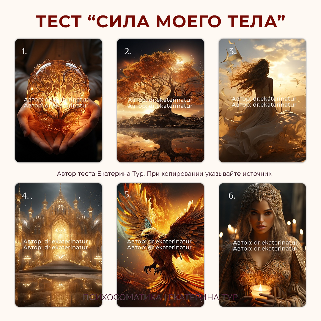 Сегодня мы предлагаем пройти уникальный тест от Екатерины Тур о скрытой силе вашего тела, которая поможет выйти на новый уровень жизни. Выбирайте одну карту, которая ярче всего резонирует с вашим внутренним состоянием в данный момент: Поделитесь в комментариях, что вы думаете о результате теста. Также приглашаем к работе со стыдом и освобождением от его пут: присоединиться к тренингу и начать слушать мета-медитацию "Бесстыжая" (доступна сразу после покупки!).