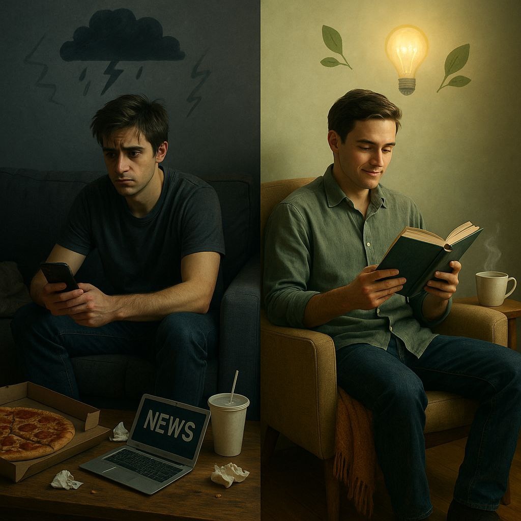 🔥 До vs После... или мамочка, роди меня обратно! 🔥 📍 Видели ролики на YouTube, где атлеты-культуристы специально запускают себя? Съедают тонны бургеров, запивают газировкой, и буквально на глазах превращаются в свою противоположность. А затем так же стремительно восстанавливают форму, возвращаясь к адекватному питанию и спорту....так и хочется сказать: "Осторожно, не повторять! Работают профессионалы." ➡️ Я провёл похожий эксперимент, только в другой сфере: решил устроить себе марафон информационного фастфуда и начал активно поглощать новости из всевозможных каналов. Что я получил: 📌 Катастрофическое снижение интереса к чтению книг и любой другой информации, требующей концентрации внимания. 📌 Зависимость и прокрастинацию — любое важное дело с лёгкостью заменялось скроллингом бесконечных новостей. 📌 Рост необъяснимой тревожности и эмоциональная апатия. 📌 Потеря осознанности — мысли начали хаотично бегать по кругу без какого-либо контроля. 🤔 Что же ждёт дальше, если продо