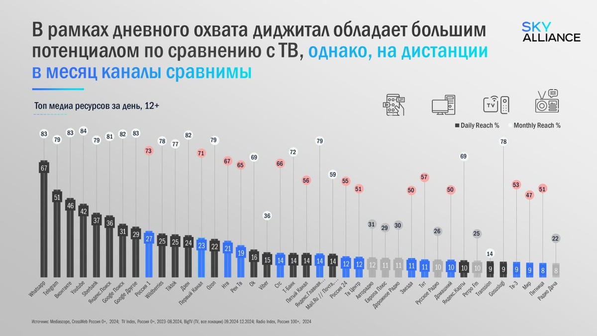 В рамках дневного охвата диджитал обладает большим потенциалом по сравнению с ТВ, однако, на дистанции в месяц каналы сравнимы.