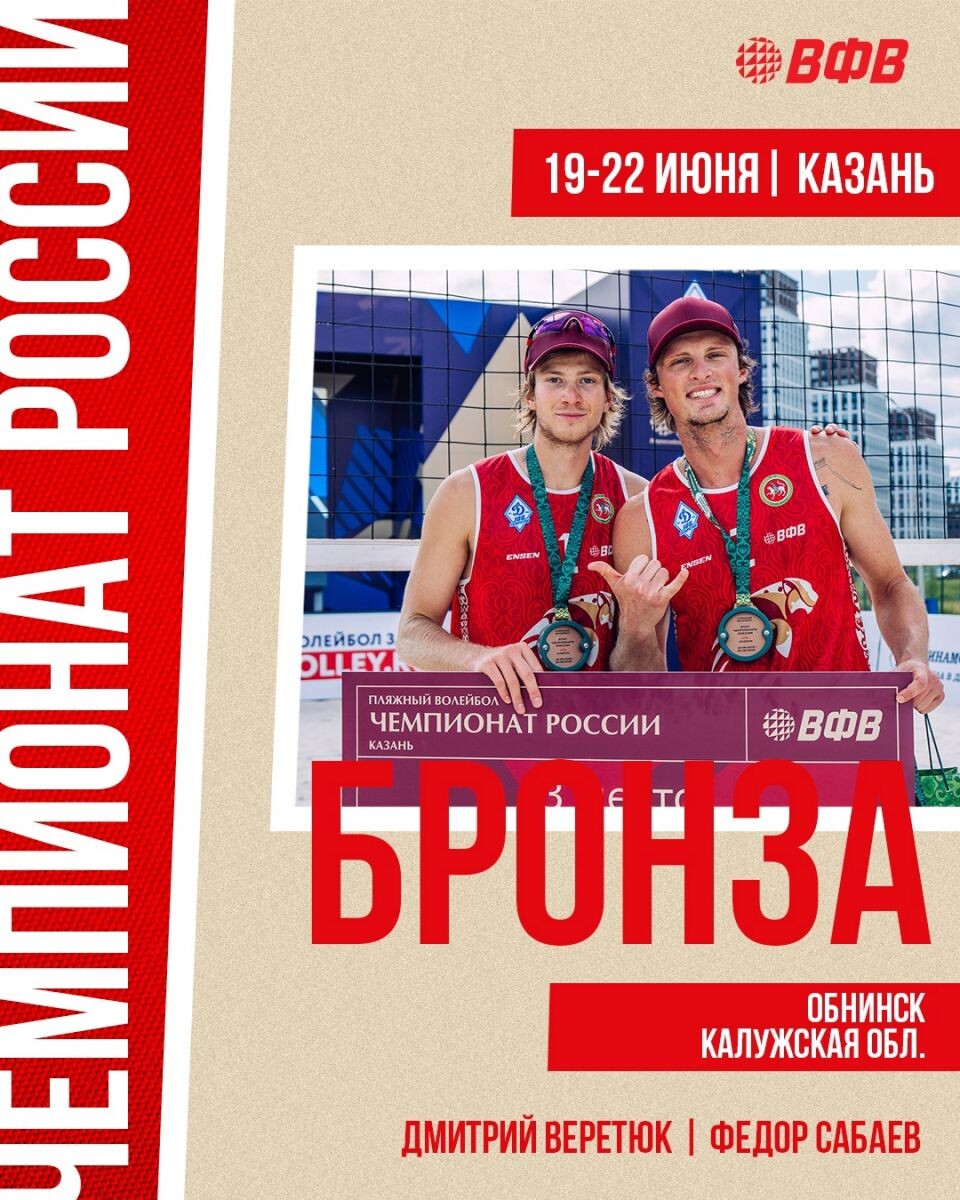 В Казани завершился VI этап Чемпионата России по пляжному волейболу. Дуэт обнинских волейболистов Дмитрий Веретюк/Фёдор Сабаев вновь оказались на пьедестале почёта турнира - они завоевали бронзовые медали. В четвертьфинальном поединке наши спортсмены выиграли у пары из Москвы Шустров/ Гусев, а полуфинале уступили будущим серебряным призёрам этапа Эверт/ Мартыненко. В матче за третье место победа осталась за обнинской парой со счётом 2:0 (их соперники - белорусы Александр Дедков и Павел Петрушко выбыли из борьбы по медицинским показаниям - сильная аллергическая реакция - Павла Петрушко ужалила оса). Напомним, что на предыдущем этапе в Орле обнинские пляжники также заняли третье место. Следующий этап Чемпионата России по пляжному волейболу пройдёт с 3 по 6 июля в Северодвинске.