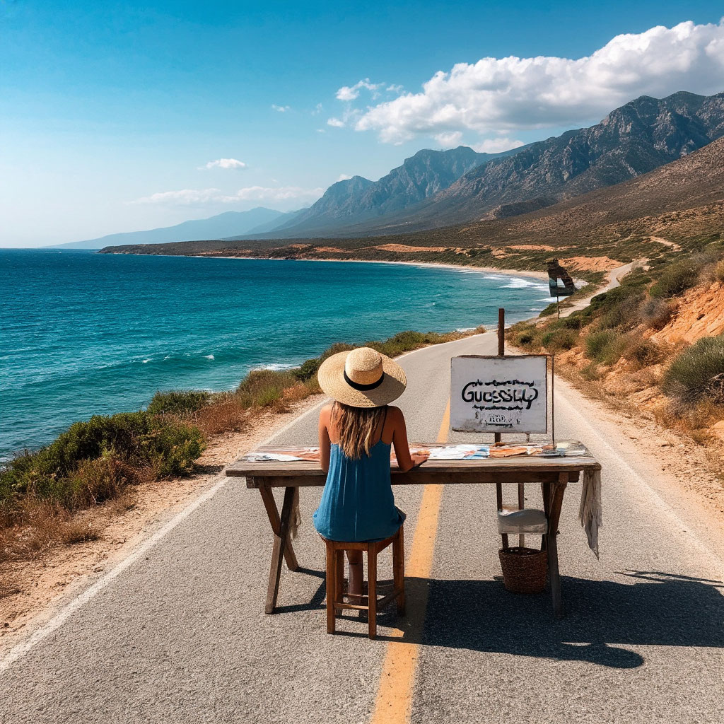 ...И была пустынная дорога. С одной стороны – дикий берег, с другой – горы, подмытые водою. Обнажились их каменные морщинистые склоны. На дороге, в плетенном кресле, у раскладного столика сидела девушка, в такой большой шляпе, что не было видно ее лица. На столике стояла табличка «Гадаю по руке».