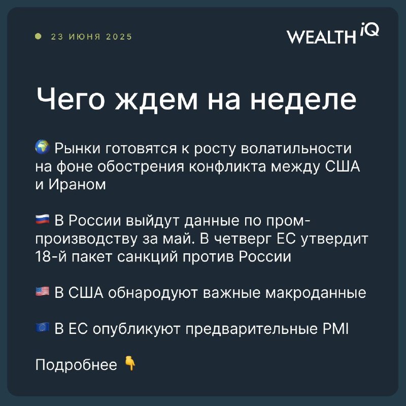 🗓 Доброе утро! На этой неделе рынки готовятся к росту волатильности, ЕС объявляет новый пакет санкций 🌍 Рынки готовятся к росту волатильности на фоне обострения конфликта между США и Ираном. Геополитика вновь выходит на первый план. 🇷🇺 Россия: данные по промпроизводству и день акционера Мосбиржи Выйдут данные по промышленному производству за май — индикатор состояния реального сектора экономики. В четверг на саммите лидеров ЕС Евросовет утвердит 18-й пакет санкций против России. Из корпоративных событий: в среду — день акционера Московской биржи; в четверг — отчет «Диасофта» по МСФО за 2024 финансовый год. 🇺🇸 США: инфляция, ВВП и выступление Пауэлла Ключевые макроданные недели: предварительный PMI в производстве и услугах за июнь; финальные данные по ВВП за I квартал; ценовой индекс расходов на личное потребление (PCE) за май. Также состоится выступление главы ФРС Джерома Пауэлла. Отчитываются Nike, General Mills и FedEx. 🇪🇺 Еврозона: деловая активность Будут опублик