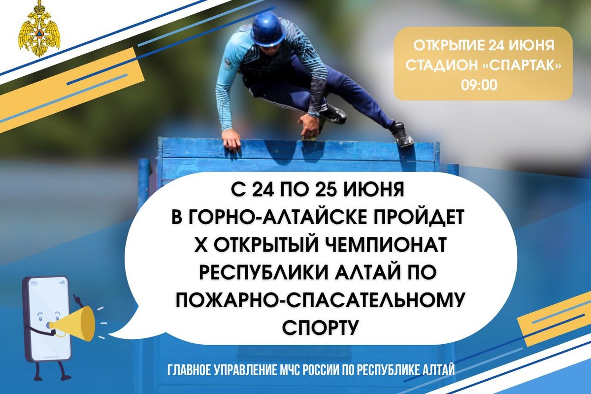 🙂🙂🙂🙂🙂🙂🙂 С 24 по 25 июня в Горно-Алтайске пройдет Х открытый чемпионат Республики Алтай по пожарно-спасательному спорту, посвященный памяти Валерия Анатольевича Головина. Более 120 спортсменов из разных районов республики продемонстрируют свои физические качества в спортивных дисциплинах пожарно-спасательного спорта. В течение двух дней взрослые и детские команды посоревнуются в прохождении: ✅полоса препятствий (стадион «Спартак» г.Горно-Алтайск); ✅ пожарная эстафета (стадион «Спартак» г.Горно-Алтайск); ✅подъем по штурмовой лестнице в окно учебной башни (территория пожарно-спасательной части № 1 г.Горно-Алтайска). Церемония торжественного открытия состоится 24 июня на стадионе «Спартак» в 09:00. 📢Приглашаем всех желающих поддержать участников соревнований и насладиться зрелищными состязаниями! @04mchs