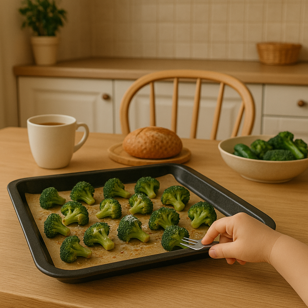 Дело было вечером, делать было нечего — точнее, делать-то было много, но руки не доходили. Макс с Мишей устроили заплыв в ванне с лего-пиратами, Даша решила, что её место исключительно на мне, а не в шезлонге. Муж задержался на работе. А я, стоя на кухне с глазами той самой совы из мемов, смотрела в холодильник и думала: «Хоть бы что-то полезное и быстрое». И вот оно — озарение. В недрах морозилки обнаружился пакет замороженной брокколи. Да, не героическое мясо или наваристый суп, но ЗЕЛЕНЬ. Шанс на ужин, ради которого не надо разбирать половину кухни и устраивать перформанс в стиле «МастерШеф». Открыла рецепт, который недавно сохранила — и понеслась. 10 минут в духовке, потом чуть масла, чеснок, лимон — и ещё 10 минут. Пока брокколи жарилась, я спела с Дашей два куплета «Антошки», договорилась с пиратами о перемирии и даже поставила чайник. А потом случилось чудо: Макс сказал, что брокколи вкуснее, чем наггетсы, и это было не в шутку. Миша добавил: «Можно ещё деревьев?» (так он называ
