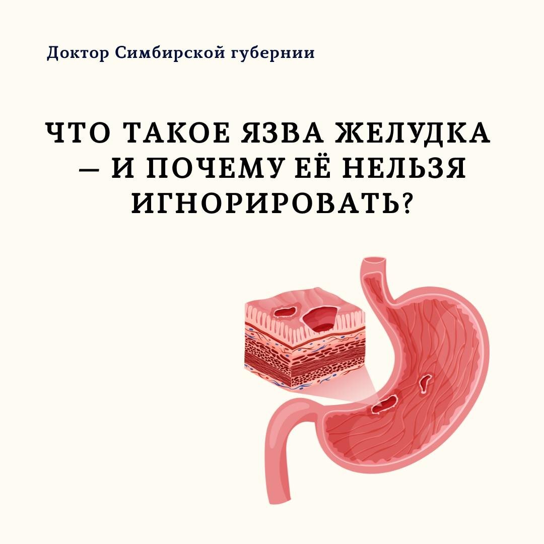 Язва желудка — это дефект слизистой оболочки желудка, который возникает, когда агрессивные факторы (например, желудочная кислота) побеждают защиту этой оболочки. В отличие от гастрита, при язве нарушается не только поверхность, но и более глубокие слои стенки желудка. 🔬 Почему возникает язва? На первом месте — бактерия Helicobacter pylori. Она живёт в желудке, повреждает слизистую и провоцирует воспаление. На втором — длительный приём обезболивающих из группы НПВС (например, ибупрофен, диклофенак). Реже — стрессы, курение, алкоголь, генетическая предрасположенность. 📍 Какие симптомы должны насторожить? — Жгучая боль в верхней части живота (особенно натощак или ночью) — Тошнота, снижение аппетита — Тяжесть после еды — Иногда — рвота с кровью или чёрный стул (если язва кровоточит) 🩺 Как диагностируют? — Гастроскопия — основной метод. Через рот вводится тонкая трубка с камерой, врач осматривает желудок изнутри. — Анализы на Helicobacter pylori: лучше всего работает дыхательный тест