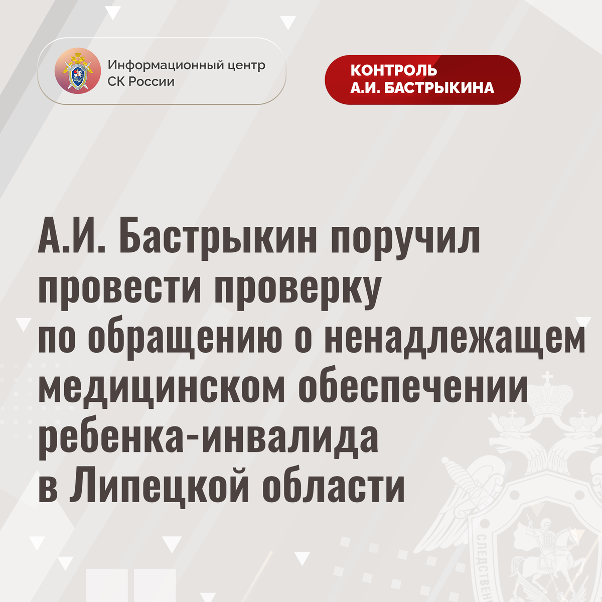 А.И. Бастрыкин поручил провести проверку по обращению о ненадлежащем медицинском обеспечении ребенка-инвалида в Липецкой области