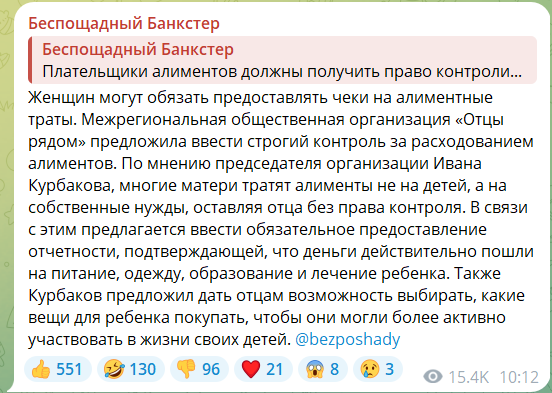...вечную сказочку про алименты не начать ли с начала? Ведь вроде бы давно всем ясно, что все мужики - рогатые животные, а все бабы - ночные бабочки, поэтому в разводе первые алиментов вовсе не платят, а вторые тратят их не по назначению - но некий председатель некой организации опять заявил о том, что надо бы нам ввести строгий контроль за расходованием алиментов, чтобы не вздумала ни одна продажная женщина на 17 201 рубль (или половину от этой суммы - поправьте, кто шарит), полученные от несчастного отца-трудяги, возить своих любовников на Мальдивы! Разумеется, изредка бывают ситуации, когда алиментов отец платит какую-то космическую сумму, а мать при этом не работает и имеет кучу расходов на себя - этих случаев, правда, исчезающе мало, и в большинстве из них отец идёт в суд и определяет место жительства ребёнка с ним. Это, безусловно, дело нелёгкое, и даже юристы советуют до похода в суд ребёнка себе забирать, а потом уже по суду это дело легализовывать - но если ты действительно хо