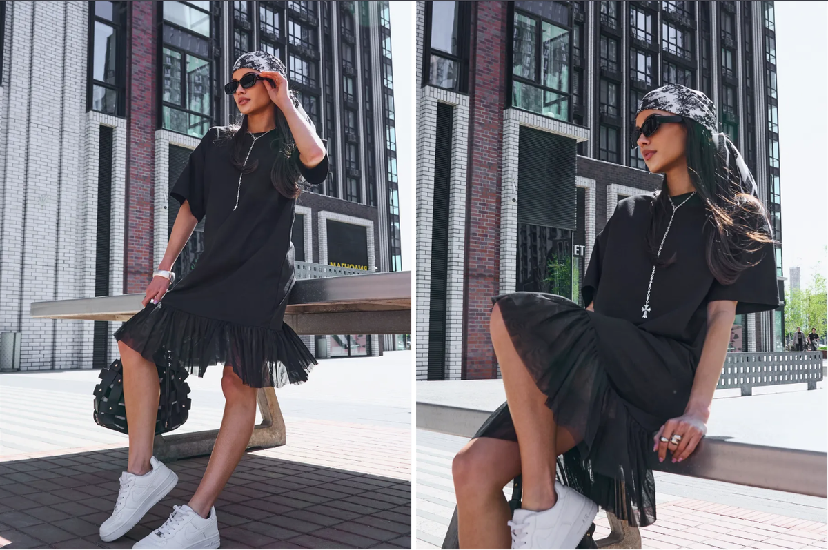 Летнее платье с эффектом многослойности, где сочетаются мягкий трикотаж и воздушная сетка. Верхняя часть выполнена в виде футболки из хлопкового трикотажа, а низ — это фатиновая юбка с необработанным краем. Модель оверсайз не сковывает движений, а полупрозрачный низ добавляет лёгкой женственности.
