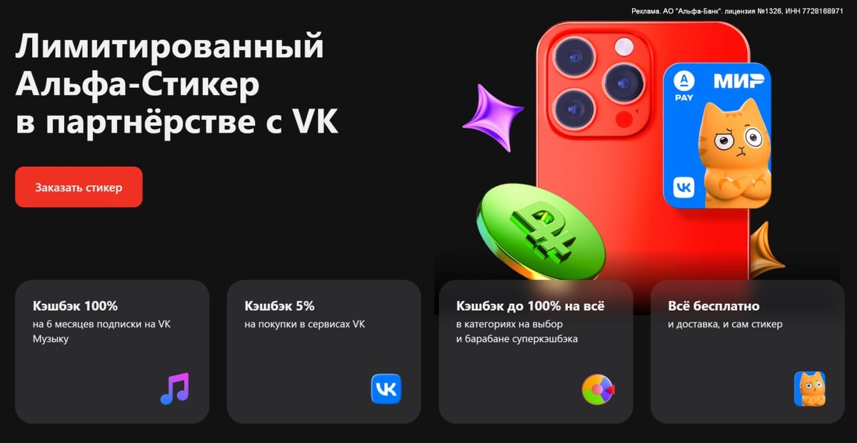 🔺 💙 Альфа + VK = бесплатный стикер стикер с кэшбэком до 100