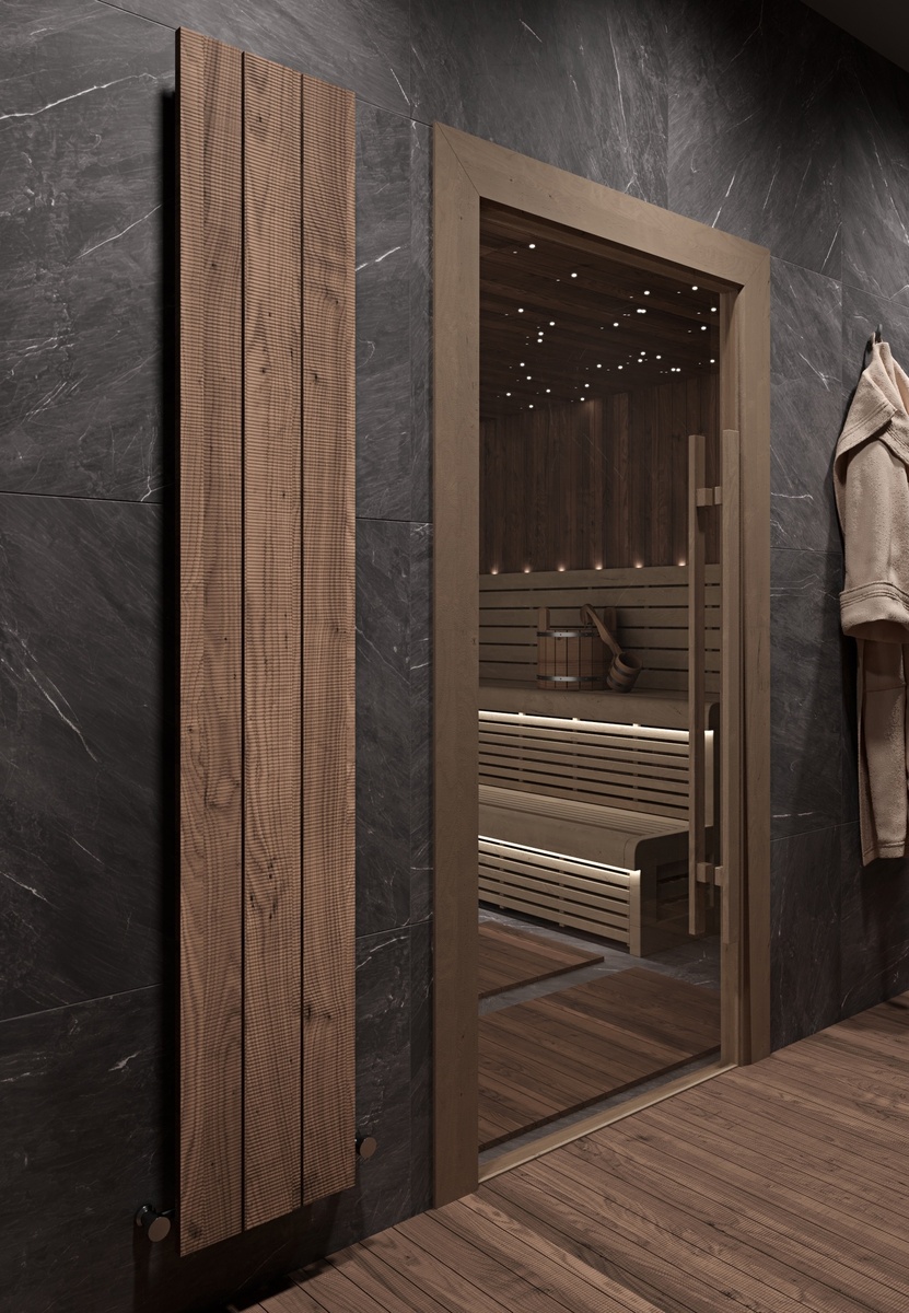 Вы не найдёте такой радиатор в магазинах. Потому что он сделан под конкретное пространство, задачу и стиль. Темно-серая плитка, дерево, тёплый свет — всё про уют и атмосферу. В таком интерьере обычный радиатор выглядел бы чужеродно. Поэтому здесь — индивидуальный заказ: фактура под дерево, нестандартная высота, компактная глубина. Установлен в предбаннике, где важна и эстетика, и надёжность. Mivarmo — это не просто “декор под дерево”, это алюминиевый корпус, прочность, стойкость к влаге и равномерный прогрев. Если у вас есть особенное пространство — баня, SPA-зона, комната отдыха — мы сделаем радиатор, который не придётся прятать. Он будет точно под стиль, точно под размеры, и точно в тему.