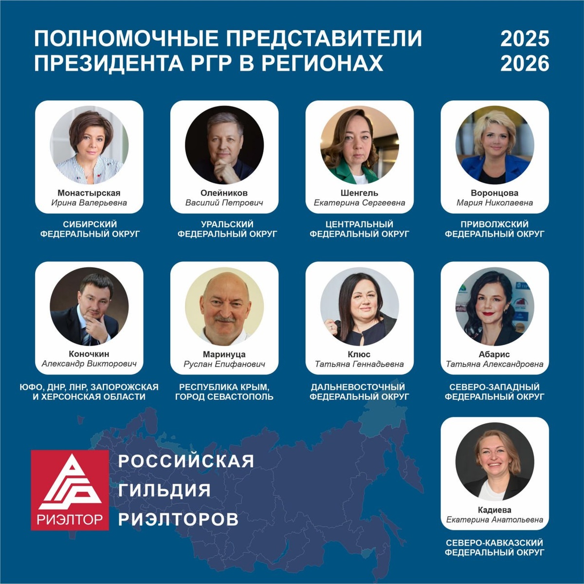 Представляем вашему вниманию полномочных представителей Президента РГР в федеральных округах на 2025-2026 года: Монастырская Ирина Валерьевна - СИБИРСКИЙ ФЕДЕРАЛЬНЫЙ ОКРУГ Олейников Василий Петрович - УРАЛЬСКИЙ ФЕДЕРАЛЬНЫЙ ОКРУГ Шенгель Екатерина Сергеевна - ЦЕНТРАЛЬНЫЙ ФЕДЕРАЛЬНЫЙ ОКРУГ Воронцова Мария Николаевна - ПРИВОЛЖСКИЙ ФЕДЕРАЛЬНЫЙ ОКРУГ Коночкин Александр Викторович - ЮЖНЫЙ ФЕДЕРАЛЬНЫЙ ОКРУГ, ДНР, ЛНР, ЗАПОРОЖСКАЯ И ХЕРСОНСКАЯ ОБЛАСТИ Маринуца Руслан Епифанович - РЕСПУБЛИКА КРЫМ, ГОРОД СЕВАСТОПОЛЬ Клюс Татьяна Геннадьевна - ДАЛЬНЕВОСТОЧНЫЙ ФЕДЕРАЛЬНЫЙ ОКРУГ Абарис Татьяна Александровна - СЕВЕРО-ЗАПАДНЫЙ ФЕДЕРАЛЬНЫЙ ОКРУГ Кадиева Екатерина Анатольевна - СЕВЕРО-КАВКАЗСКИЙ ФЕДЕРАЛЬНЫЙ ОКРУГ #структураРГР