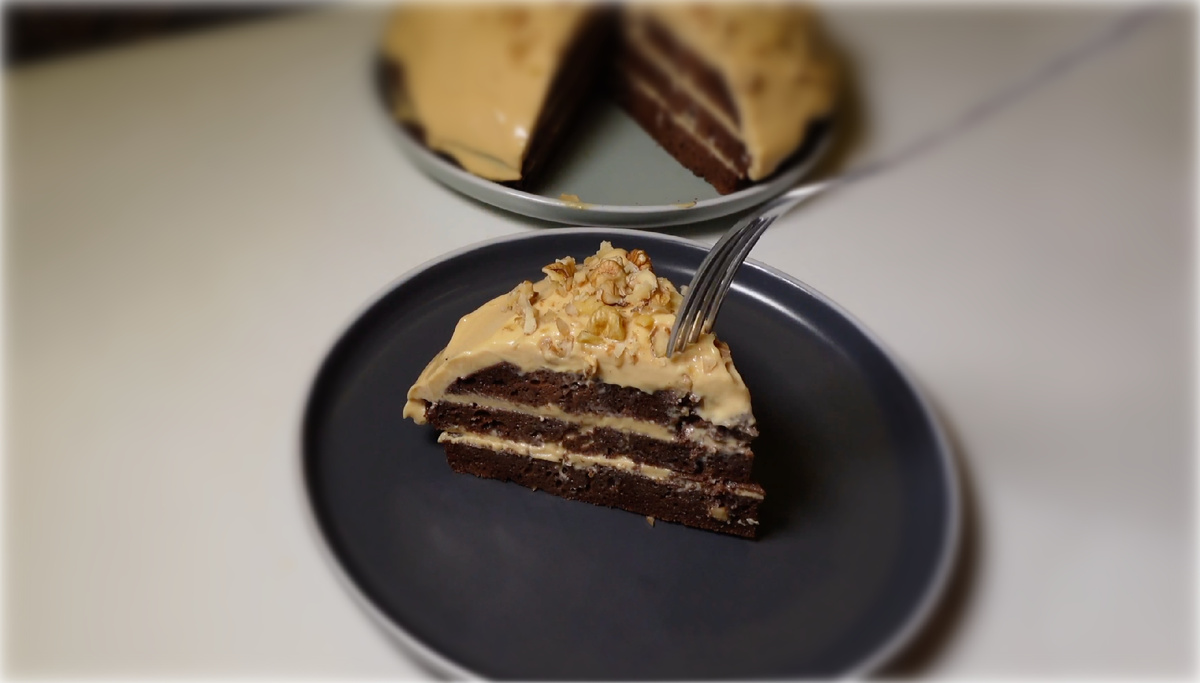 6. Корж разрезаем и начинаем собирать наш торт, каждый корж пропитываем кофе, в конце сверху украшаем грецким орехом.