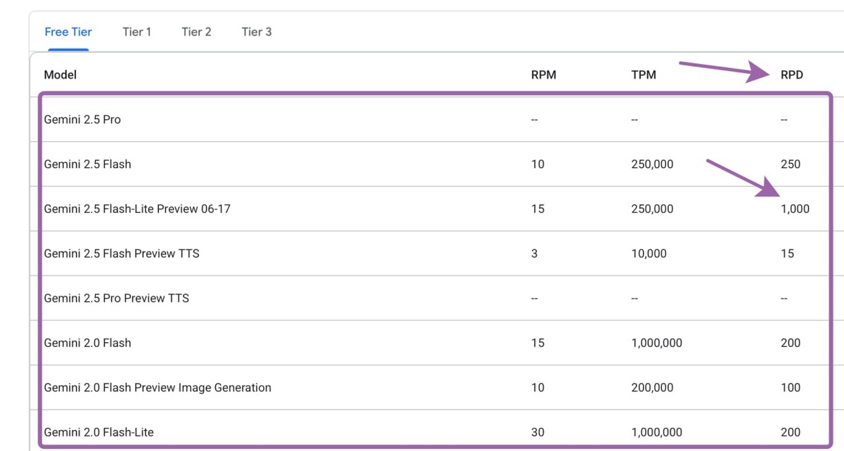 Google втихую, как крысы :), пересмотрел бесплатные лимиты по API к их нейронкам. Текущие дневные лимиты подсветил на картинке - RPD. Вообще это не здорово, но пока терпимо. К чести Google они единственные, кто вообще дает бесплатный доступ по API к своим топовым ИИ. Русский ИТ бизнес