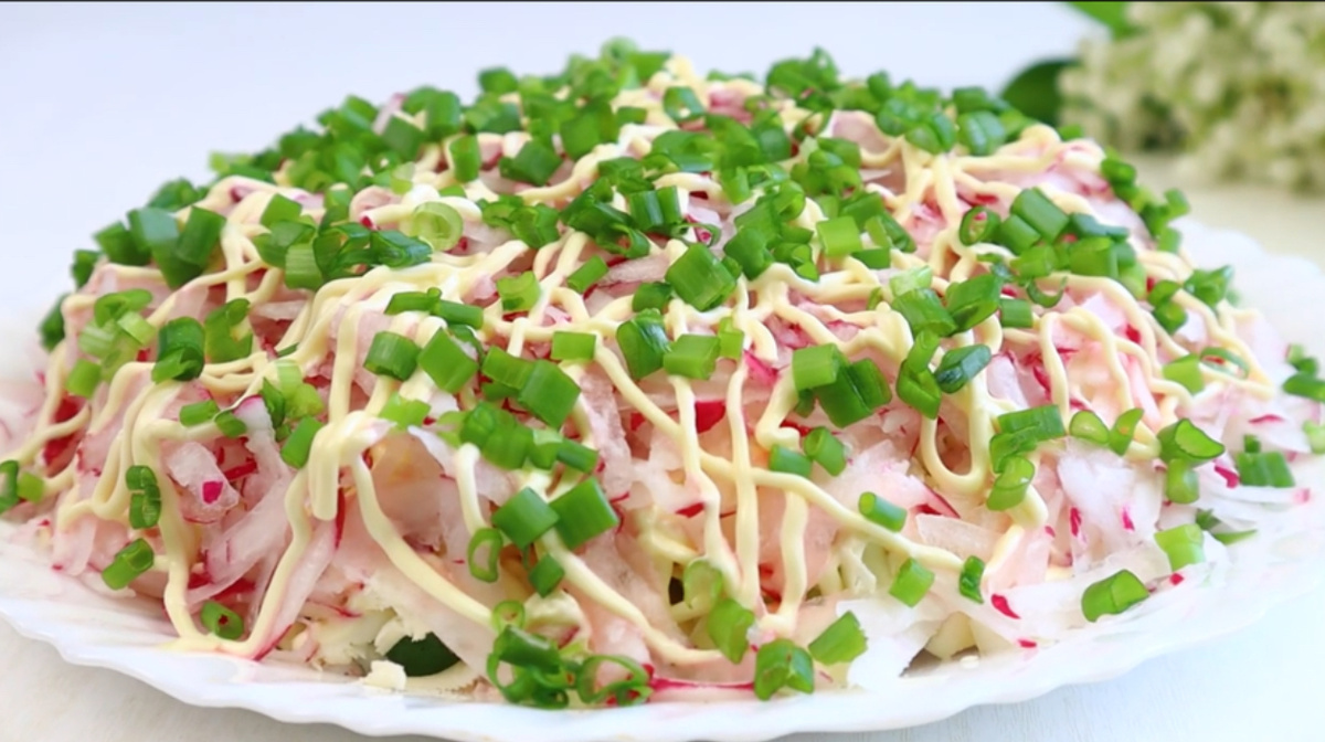 Сегодня рецепт очень вкусного, сочного салата всего из 4 - х основных ингредиентов. Быстрый и простой в приготовлении закусочный салат с крабовыми палочками и редиской украсит любой стол!
