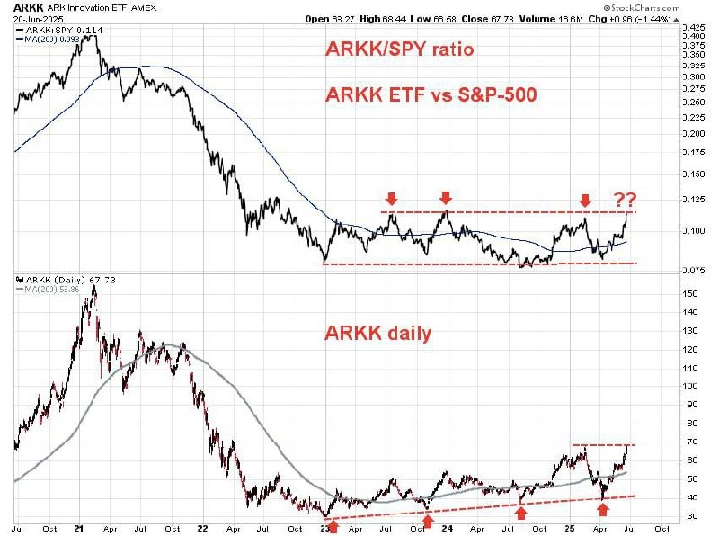 Интересные вещи происходят на рынке. С одной стороны, очаги геополитической напряженности с угрозой перерастания в затяжную войн… Интересные вещи происходят на рынке. С одной стороны, очаги геополитической напряженности с угрозой перерастания в затяжную войну. Это, по идее, должно снижать риск-аппетит инвесторов в акции. С другой стороны, израильский индекс торгуется в плюс с самого начала конфликта с Ираном и вчера вышел-снова- на исторический максимум. Но я сейчас даже не о нем, а о более близком для меня рынке акций США. Большинству читателей не нужно напоминать про Кэти Вуд с ее семейством фондов ARK Invest. Флагманский ARKK наделал шума в 2020-2022 гг., сделав сначала 5х вверх, а затем 5х вниз. Портфель этого фонда включает компании, которые инвесторы покупают больше на ожиданиях светлого будущего, чем на основе текущих финансовых показателей, и поэтому спрос на него косвенно отражает существующий риск-аппетит инвесторов в акции. И вот именно сейчас, когда уровень неопределенн