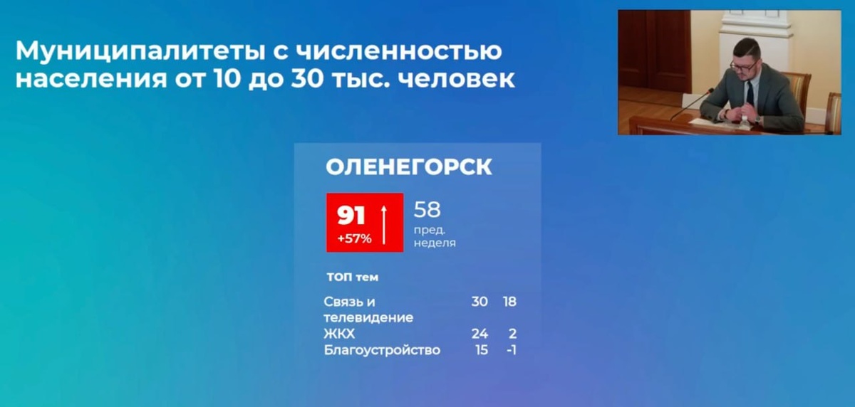 На прошлой неделе, согласно докладу руководителя ЦУРа Артёма Марышева, жители Оленегорска чаще всего жаловались на перебои в работе