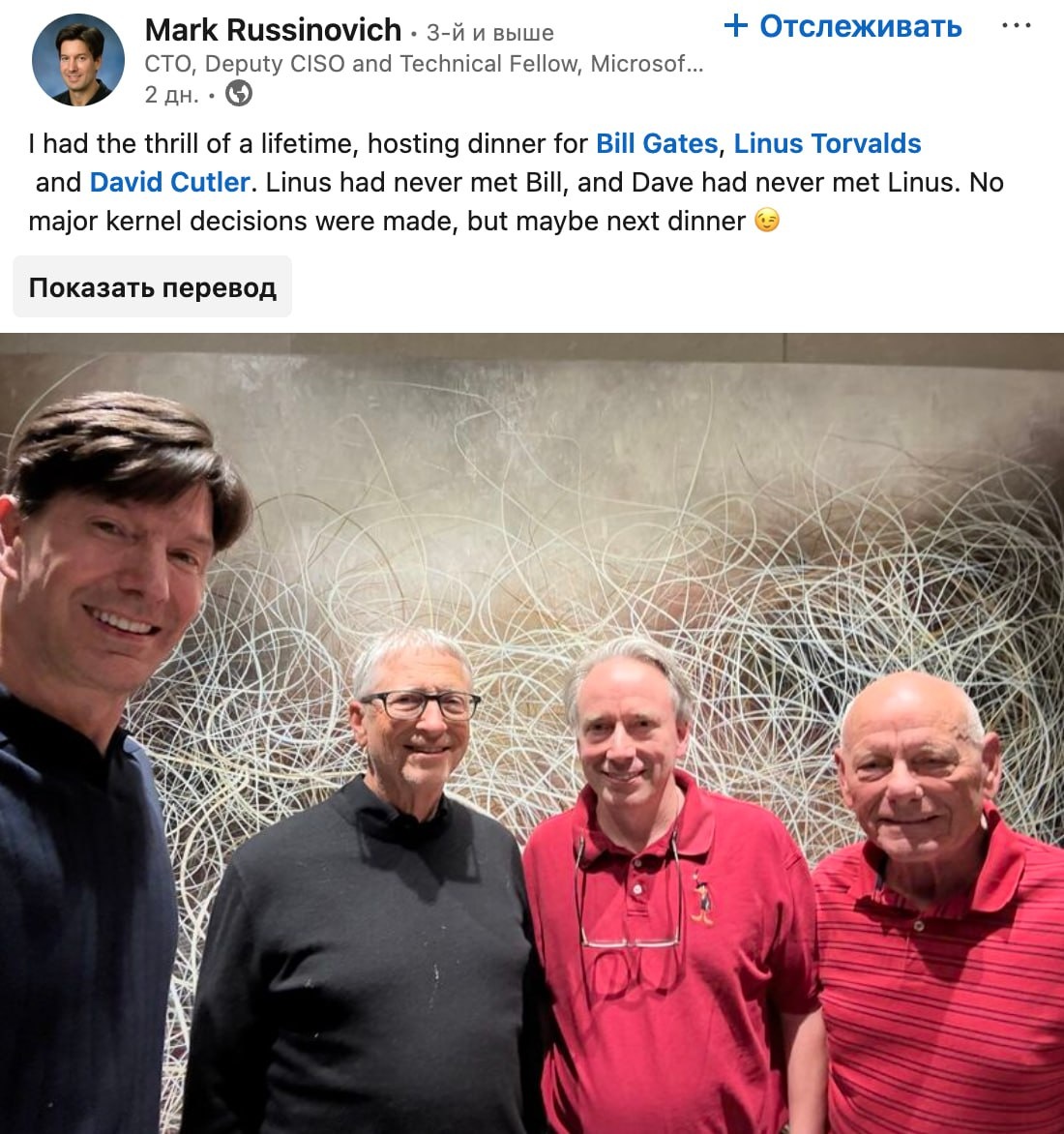 Фото дня: Билл Гейтс впервые встретился с Линусом Торвальдсом, создателем Linux. Ужин для этих двух культовых фигур, а также Дэвида Катлера, организовал CTO Microsoft Azure Марк Руссинович. Он поделился своими впечатлениями: Получил острых ощущений на всю жизнь, устроив ужин для Билла Гейтса, Линуса Торвальдса и Дэвида Катлера. Линус никогда не встречался с Биллом, а Дэвид никогда не встречался с Линусом. Никаких важных решений по ядру принято не было, но, может быть, в следующий раз 😉 Интересно, кто подаст заявку на Lindows в будущем? Для более детального взгляда на эту удивительную встречу, вы можете ознакомиться с постом Марка здесь. Наш уютный канальчик 🤖 Анимация | СhatGPT-4 | Помощь с резюме