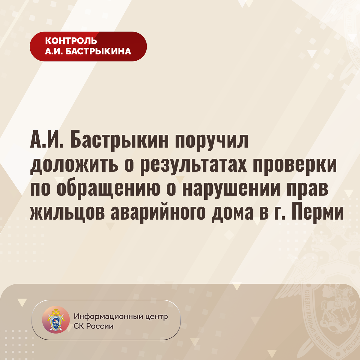 А.И. Бастрыкин поручил доложить о результатах проверки по обращению о нарушении прав жильцов аварийного дома в г. Перми В социальной сети СК России сообщается о нарушении прав жильцов многоквартирного дома по улице Сусанина в городе Перми. Здание, 1954 года постройки, признано аварийным в 2016 году и находится в непригодном состоянии ввиду значительного износа несущих конструкций. Вместе с тем мер к предоставлению гражданам благоустроенного жилья не принимается. Многочисленные обращения результатов не принесли. В СУ СК России по Пермскому краю по доводам комментария организована процессуальная проверка. Председатель Следственного комитета Российской Федерации Александр Иванович Бастрыкин поручил и.о. руководителя СУ СК России по Пермскому краю Валерию Александровичу Сафонову доложить о предварительных и окончательных результатах процессуальной проверки. Исполнение поручения, а также ход процессуальной проверки поставлены на контроль в центральном аппарате ведомства. #СледственныйКомите