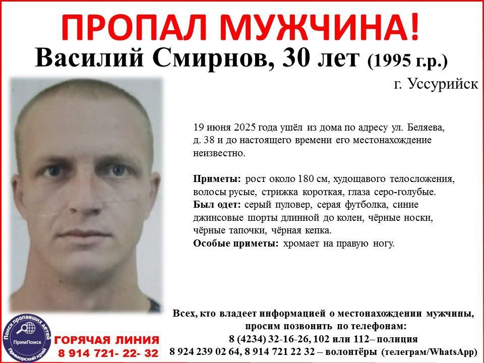 ВНИМАНИЕ! ПРОПАЛ МУЖЧИНА! Василий Смирнов, 30 лет (1995 г.р.) г. Уссурийск 19 июня 2025 года ушёл из дома по адресу ул. Беляева, д. 38 и до настоящего времени его местонахождение неизвестно. Приметы: рост около 180 см, худощавого телосложения, волосы русые, стрижка короткая, глаза серо-голубые. Был одет: серый пуловер, серая футболка, синие джинсовые шорты длинной до колен, чёрные носки, чёрные тапочки, чёрная кепка. Особые приметы: хромает на правую ногу. Всех, кто владеет информацией о местонахождении мужчины, просим позвонить по телефонам: 8 (4234) 32-16-26, 102 или 112– полиция 8 924 239 02 64, 8 914 721 22 32 – волонтёры (телеграм/WhatsApp) #поиск_Смирнов Барахолка: @uss_baraholka Подписка: @Mark2_chee