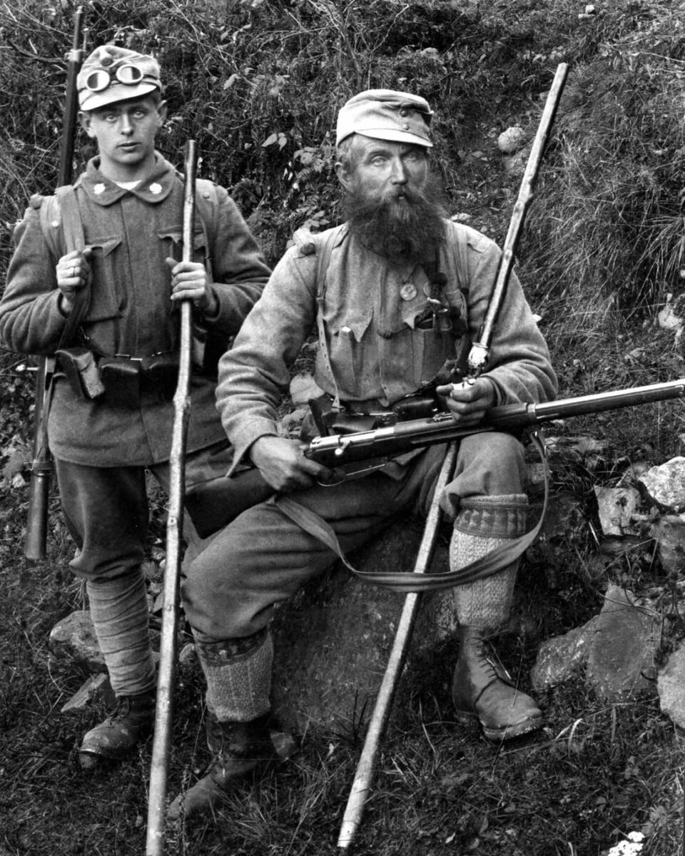 Австро-венгерские солдаты Standschütze из 3-го Инсбрукского батальона на итальянском фронте, 22 июня 1917 года. Standschützen были подразделением в составе австро-венгерской армии ополчения в горном регионе Тироль на границе с Италией. До войны их рассматривали скорее как спортивные клубы и патриотические объединения. Однако после вступления Италии в войну в мае 1915 года они были срочно мобилизованы и включены в состав оборонительных сил Южного Тироля. Командование столкнулось с дефицитом резервов и потому вынуждено было прибегнуть к ополчению. В их рядах оказались не только бывшие охотники и ремесленники, но и юноши, не достигшие призывного возраста, и пожилые мужчины. По сохранившимся документам, встречались бойцы в возрасте от 14 до более 80 лет — хоть и в исключительных случаях. С первых дней мобилизации Standschützen оказались на передовой. Они защищали перевалы и высоты, такие как Монте-Скорлуццо и Монте-Пьяно, и часто сражались бок о бок с профессиональными частями, включая
