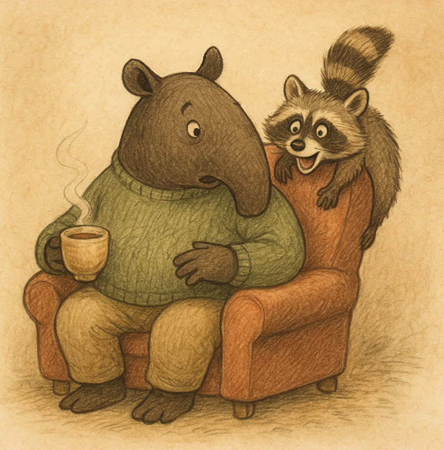 Енот был создан для того, чтобы совать нос туда, куда не просят. Он не был злым, хитрым или коварным — просто... любопытным, бесхитростным и безумно упёртым. В любой день его можно было застать в попытке влезть: • в дупло, где уже жил филин, • в корень, который оказался змеёй, • в трубу, которую давно никто не чистил, • или в норку, которая на самом деле была просто узкой трещиной между двумя камнями. Но ничто не могло остановить Енота. Даже если вчера он застрял. Даже если три дня назад его вытаскивали бобры с монтировкой. ________________________________________ Однажды Енот брёл по лесу, пока его нюх не уловил что-то особенно интересное: запах печёного корня, сушёного цвета и чуть-чуть ройбуша. И вот — Норка. Маленькая, несуразная, и, по всем законам природы, слишком узкая для кого-либо крупнее белки. Но это ведь Енот. Он втянул живот, выставил лапки, надул щёки (почему — непонятно) — и заскользнул. С глухим плюх он оказался прямо в гостиной Тапира, возле кресла, на котором сидел са