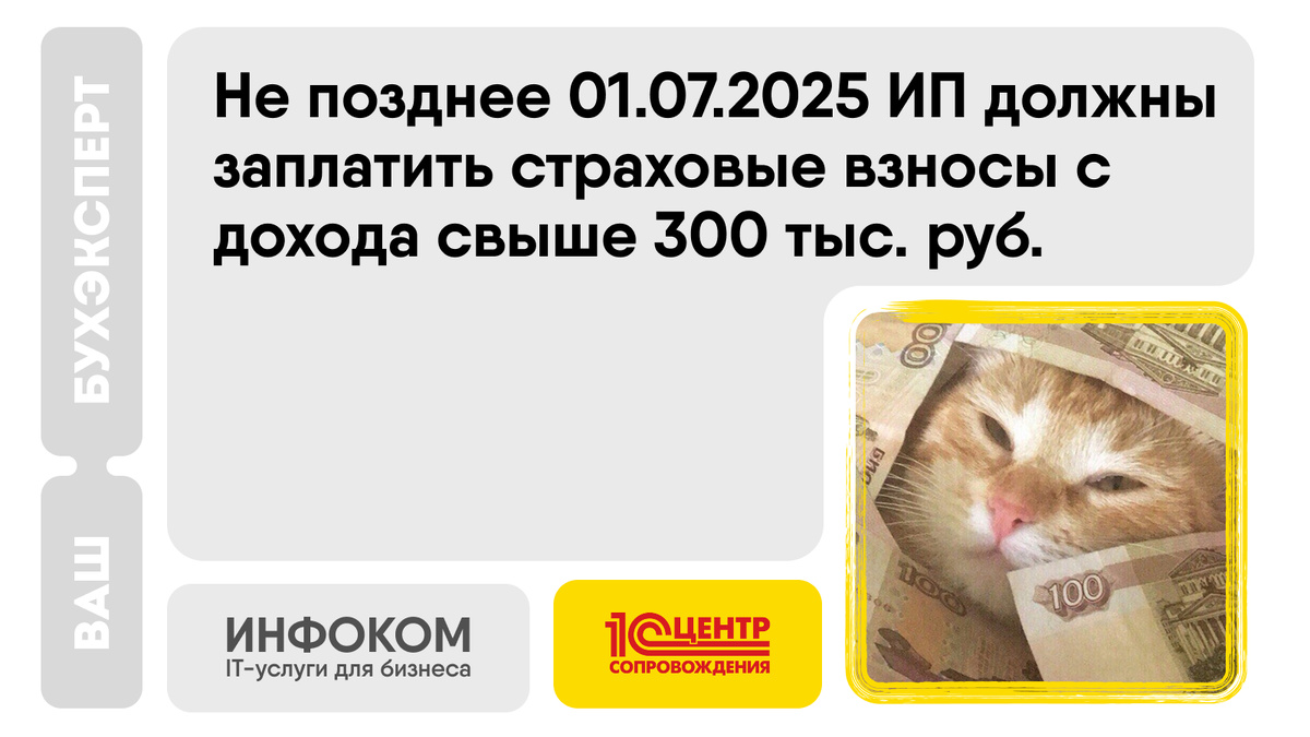 Индивидуальные предприниматели обязаны платить страховые взносы на обязательное пенсионное (ОПС) и медицинское страхование (ОМС). Если доход ИП за 2024 год превысил 300 000 рублей, с суммы превышения необходимо дополнительно перечислить 1% в ПФР. Срок уплаты этого взноса — не позднее 1 июля 2025 года (п. 2 ст. 432 НК РФ). Максимальный размер взносов