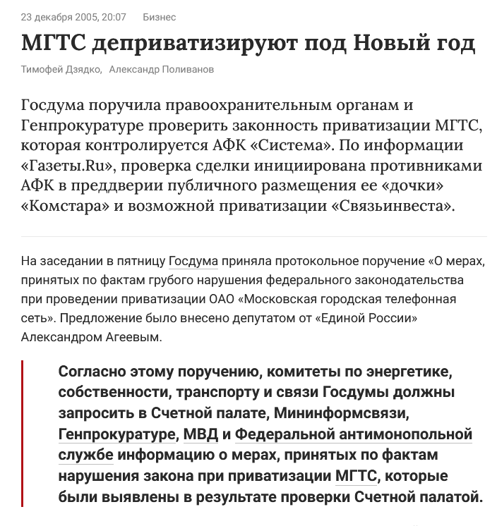 История с не совсем чистой приватизацией МГТС всплывала в средине 200-х в государственной Государственной Думе: