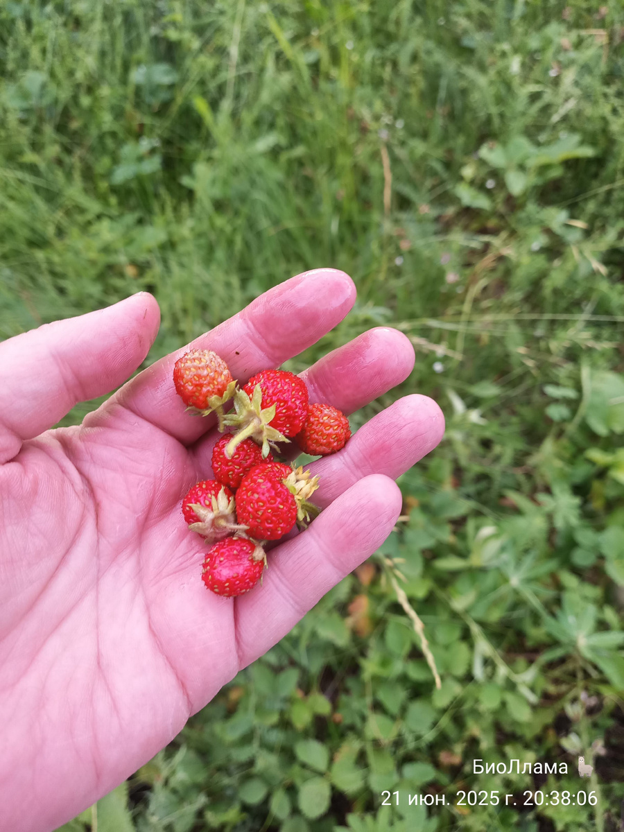 Помните, я вам рассказала, что у меня по всем двум участкам полно одичавшей земляники садовой? Она весной цветет так, что всё бело. А ягоды? Пшик один! Я тут обочину на своем участке косила, потому что надо было сетку натянуть. А там самое земляничное место. И дети соседские такие - тётя, вы будете ягоду косить? Ну, нет, говорю, оставлю вам эту ягоду, если хотите. Но там ее - одни слёзы! Где подмерзла, где засохла. Но детям все равно, им бы ягоды только поесть, хотя наверняка у каждого в огороде полно. Вот и у меня в огороде, наконец, выросла. Старая делянка перезимовала плохо, вся поднялась на корнях, думала вообще не зазеленеет. Даже обрабатывать не стала. В мороз накинула укрывной с дырами. А она взяла да и как давай цвести! И выдала урожай! Ну и молодец, я ее тогда прополола)) А новая делянка, которую осенью посадила из этих же усов, вот та точно молодец! Я её всю сеном заложила прямо весной. Она рада была, с таким-то одеяльцем! Хоть и тоже подмерзла. Но все равно довольно много