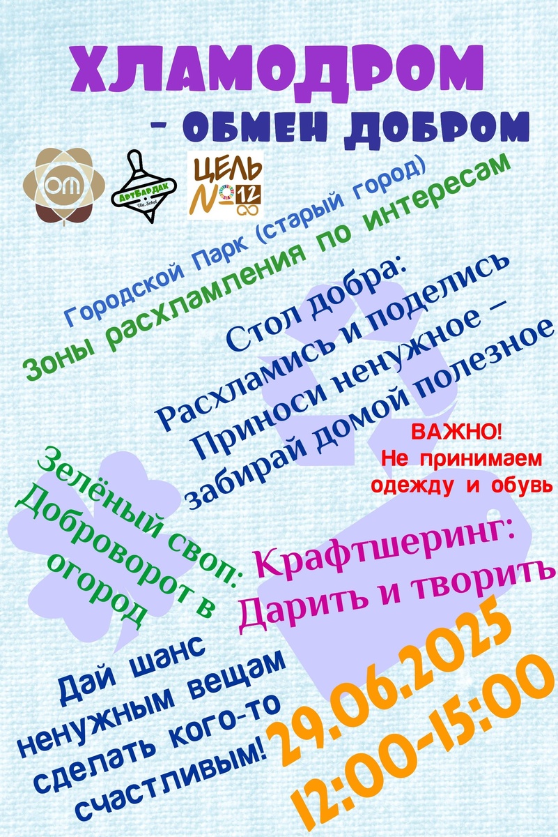 «Хламодром» – обмен добром 29 июня с 12:00 до 15:00 в Городском парке в Старом городе пройдёт «Хламодром». Не спешите выкидывать то, что вам больше не пригодится, а помогите вещам в хорошем состоянии обрести вторую жизнь. На площадке под навесом напротив сцены будут работать три зоны обмена по интересам: 📚 стол добра – посуда, предметы быта и интерьера, аксессуары, книги, настольные игры 🌱 зелёный своп – рассада, комнатные растения, саженцы, семена, садовый инвентарь 🧵 крафтшеринг – предметы для рукоделия и творчества Одежда и обувь не принимаются. Приносите ненужное – забирайте полезное! #житьЭКОлогично