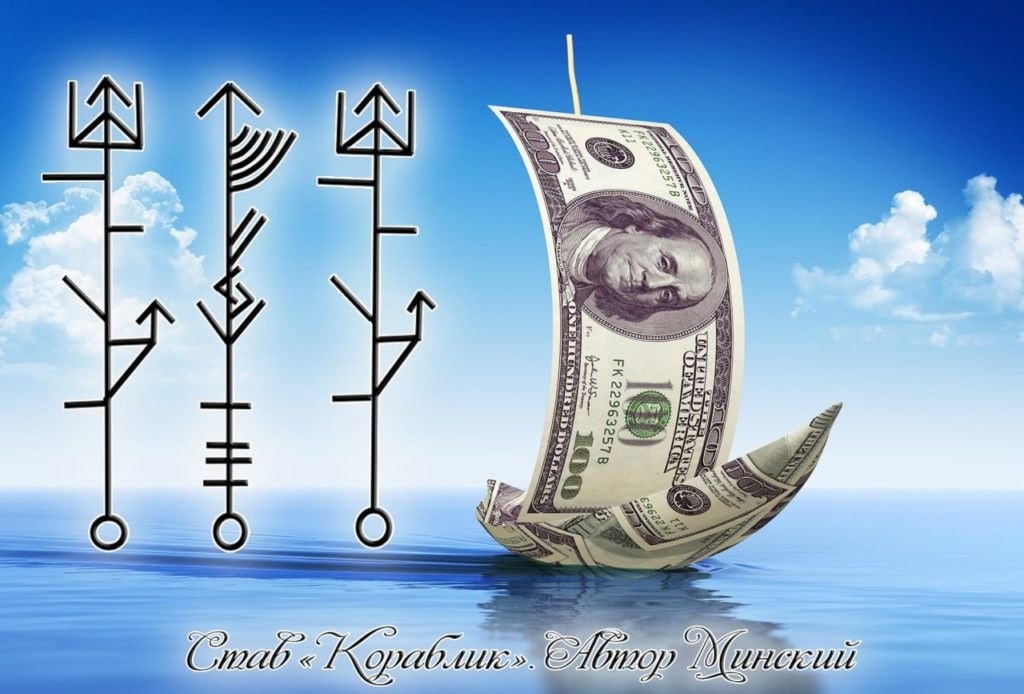 Став «Кораблик». Автор Минский Алексей. Став для финансовой победы, накопления благ и для сохранения благ Тейваз + Феху — денежная победа, победа над конкурентами, одержать победу в материальных делах и вопросах. Йера — сохранение денег и благ, чтобы не спустить все на шлюх в барах. Альгиз — защита финансов, для успеха через аспект защищенности и интуитивного понимания куда и чего потратить, а где свои булки прижать. Dyra letur — для успеха и достижения желаемого. Скальд рунир — усиление заклятья. Соль руны — для усиления става Руны ведьм (авторства Лейки Руны): Открытие дорог + Соль-рунир — дополнительное открытие дорог. Спрос на ваши услуги, на ваш товар, популярность именно ваших услуг, именного вашего товара (нет конкурентов, всем нравятся только ваши услуги и ваш товар) + Соль руна и Уруз — для привлечения клиентов и увеличения прибыли.