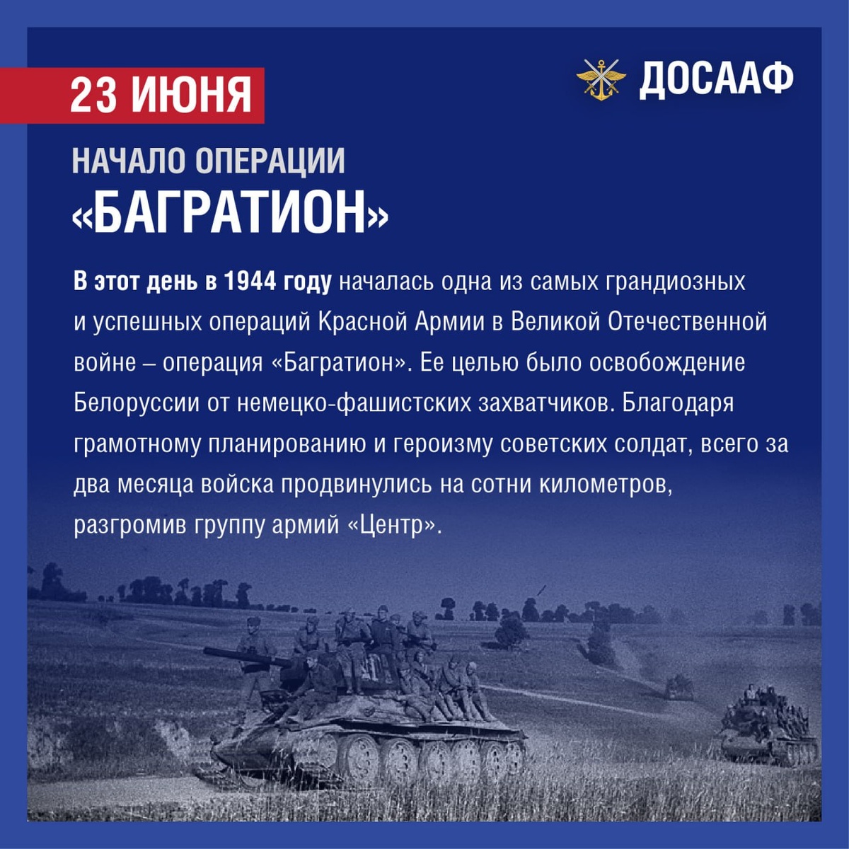 23 июня – начало операции «Багратион» В этот день в 1944 году началась одна из самых грандиозных и успешных операций Красной Армии в Великой Отечественной войне – операция «Багратион». Ее целью было освобождение Белоруссии от немецко-фашистских захватчиков. Благодаря грамотному планированию и героизму советских солдат, всего за два месяца войска продвинулись на сотни километров, разгромив группу армий «Центр». Операция «Багратион» стала триумфом советского военного искусства и показала всему миру мощь Красной Армии. Были освобождены Минск, Витебск, Могилев и другие ключевые города. Особое значение операции «Багратион» заключается не только в освобождении Белоруссии, но и в стратегическом переломе всей войны. Эта победа открыла Красной Армии путь в Польшу и Восточную Пруссию, а также вынудила немецкое командование перебросить силы с других фронтов, облегчив действия союзников в Нормандии. Память о подвиге героев операции «Багратион» живет в сердцах потомков. Мы чтим их мужество, сто