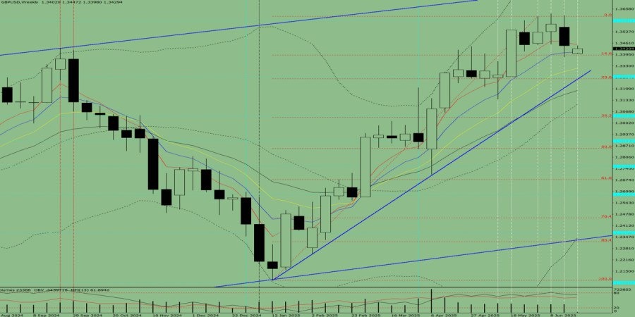 На этой неделе цена от уровня 1.3446 (закрытие последней недельной свечи) может продолжить движение вниз с целью 1.3256 – откатный уровень 23.6% (красная пунктирная линия). При тестировании этого уровня цена может начать движение вверх с целью 1.3317 – 13 средняя ЕМА (жёлтая тонкая линия).