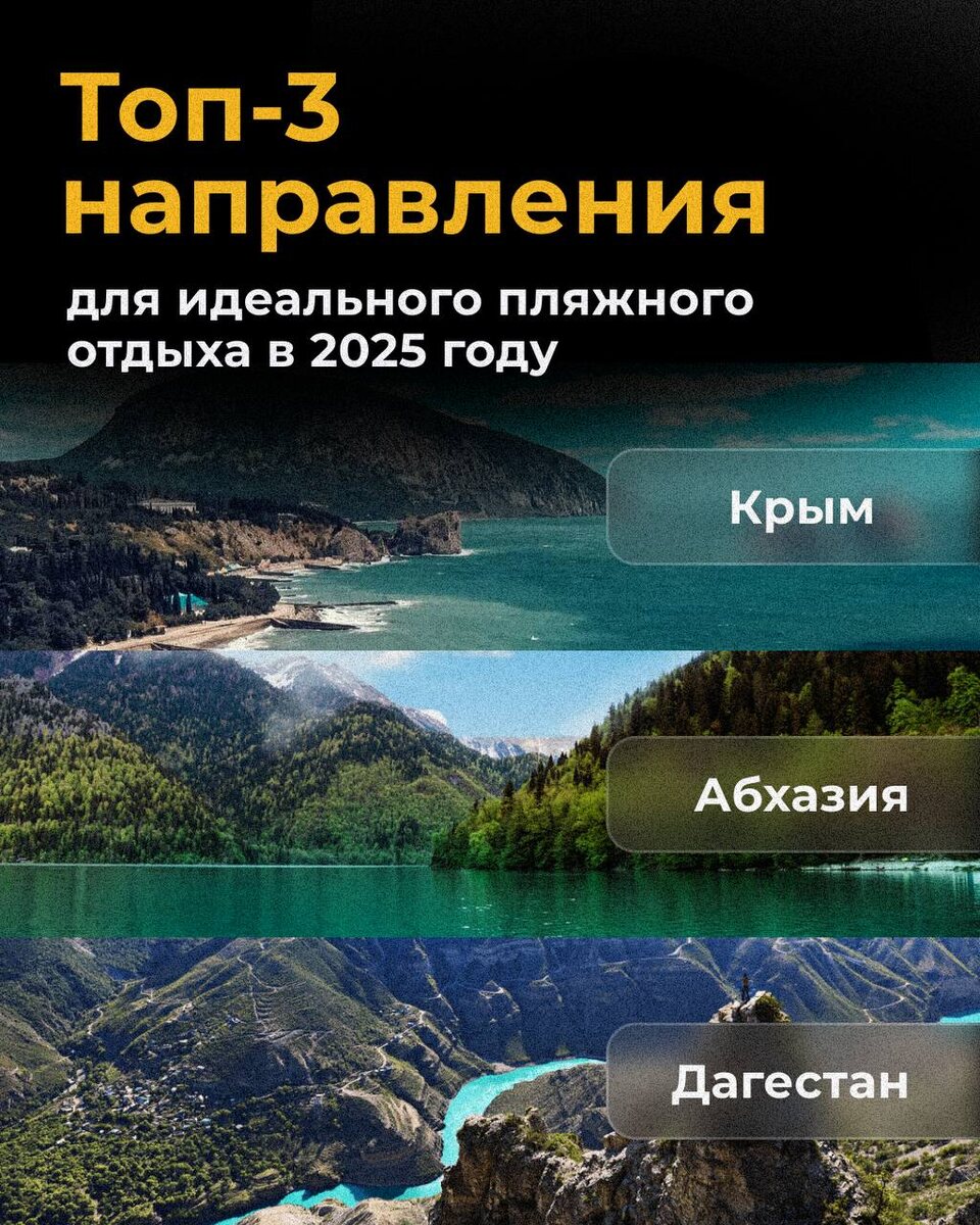Лето 2025 набирает обороты — самое время запланировать отпуск! И вот самые популярные направления этого сезона: • Крым — пляжи с золотым песком, ласковое море и потрясающая природа! Самые популярные локации: Гурзуф, Севастополь, Алушта • Абхазия — лидер зарубежного отдыха! Спрос здесь в 2 раза выше, чем на Турцию. Гагра, Сухум, Новый Афон — проверенные курорты, Гудаута и Лдзаа — новые хиты с кратно растущим спросом. • Дагестан — для тех, кто любит не только море, но и горы! Уникальная природа, вкуснейшая кухня и гостеприимство местных жителей. Почему выбирают эти направления? • Доступные цены • Развитая инфраструктура • Возможности для активного отдыха (походы, экскурсии, дайвинг) • Аутентичная атмосфера и вкуснейшая местная кухня А чтобы ваше путешествие было максимально комфортным, арендуйте автомобиль. Уже решили, куда отправитесь?