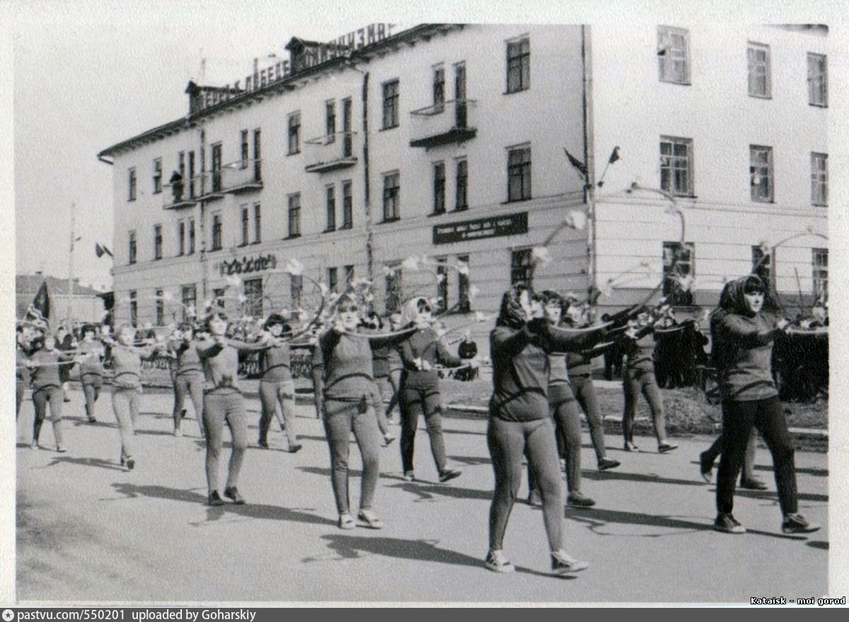 Описание: Магазин "Колос". За ним виден угол дома, стоявшего до постройки Акулова,5. Дом был на два хозяина. В одной половине жила семья Маховых, во второй - Поезжаевых.Девушки с обручами, возможно студентки педучилища .