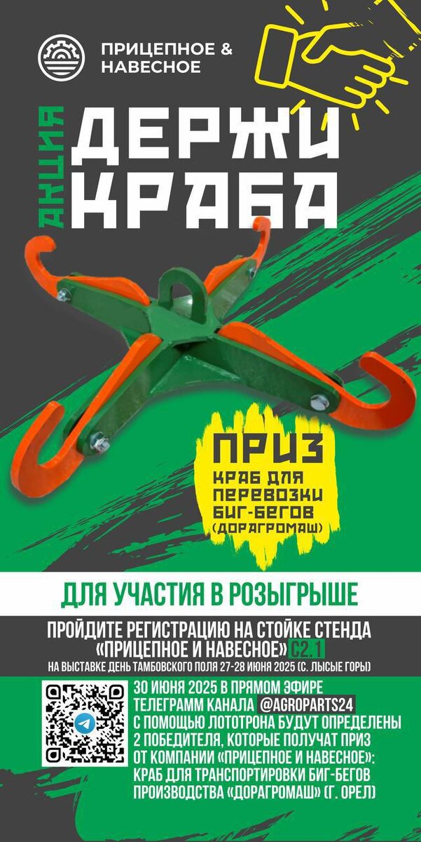 🔔АКЦИЯ "ДЕРЖИ КРАБА"! Регистрируйтесь на нашем стенде C2.1 на Дне Тамбовского поля 18-19 июля 2025 (с. Лысые Горы) и участвуйте в розыгрыше! 🔥Приз — краб для транспортировки биг-бегов от Дорагромаш (г. Орёл) 🚜 ПРИЦЕПНОЕ И НАВЕСНОЕ ☎️ 8 (4752) 503-814 📍 г. Тамбов, ул. Мичуринская, 240 🖥 Наш сайт 🤑 ПОСМОТРЕТЬ АССОРТИМЕНТ