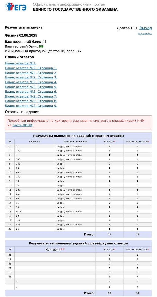 ⚡️Здравствуйте, дорогие друзья! 🔥Закончились ЕГЭ и ОГЭ 2025 года! Мы продолжаем рассказывать про лучшие результаты моих ребят и девчонок! 🎓Сегодня про Петра Долгова, 11 класс, Саратов! В этом году Петр сдавал ЕГЭ по физике, результат 98 баллов из 100 возможных и, конечно, прекрасный результат! 🎓Петр и его отец обратились ко мне в конце января! Я думал, это откровенно поздно, тем более, что стартовое тестирование у меня Петя написал на чуть более 60 баллов. Я откровенно скептически тогда относился к результату 100 или около того. 🎓Однако, Петр усердно работал, набирался опыта, задавал вопросы, много работал сам. И это принесло свои плоды. На тестировании у меня, его результат все время рос вверх. На крайнем тестировании у меня в мае он набрал 88 баллов! Классно, но все же ниже необходимого! 🎓Но мы задали правильную стратегию постоянного роста, и на экзамене Петя вышел на пик формы! И получился необходимый результат! Желаю Петру дальнейших успехов в учебе! ⚡️Ну а мы продолжаем! Можн
