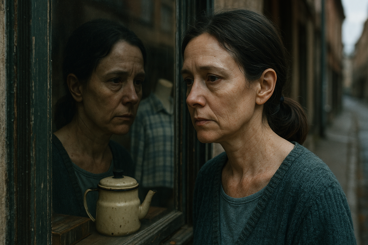 Однажды, проходя мимо витрины старого комиссионного магазина, она поймала своё отражение в стекле — между чайником советского образца и выцветшей рубашкой на пластиковом манекене. Задержалась, как будто кто-то позвал.