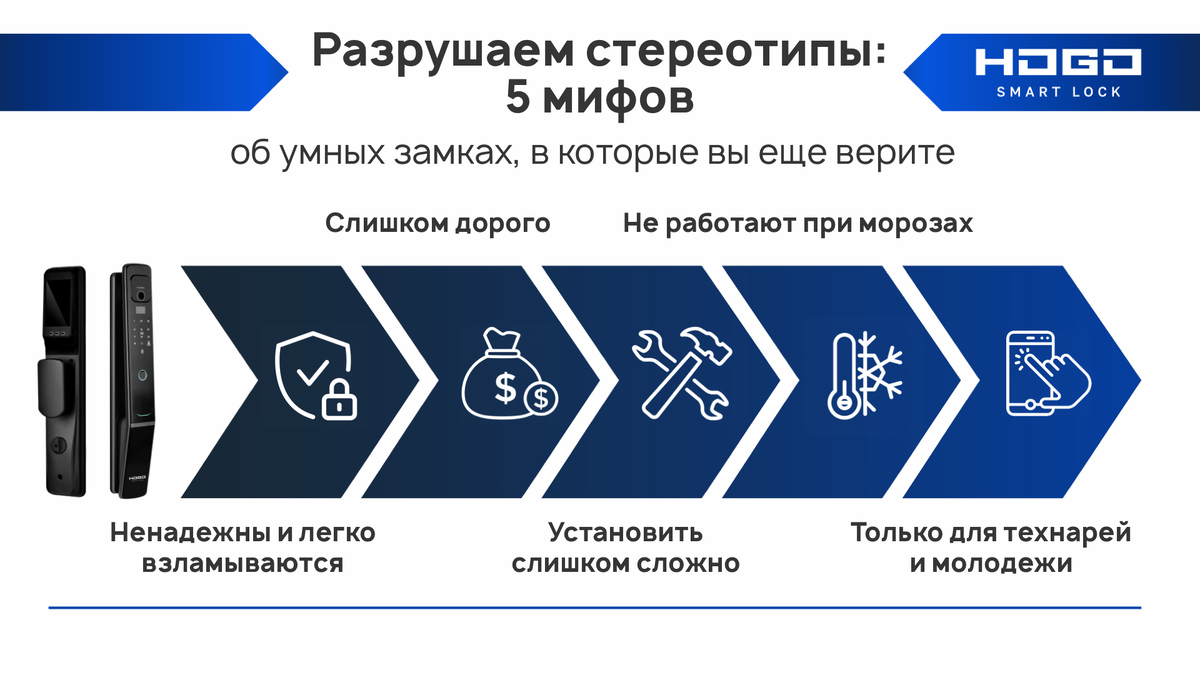 "Я не буду использовать умный замок, потому что это сложно и дорого". Сколько раз вы слышали эту фразу или даже говорили её сами? А теперь подумайте: действительно ли это так? Или вы просто попали под влияние популярных заблуждений? Давайте разберёмся, какие мифы останавливают людей от перехода на технологии будущего — и почему пора пересмотреть своё мнение. "Если это электроника, то хакеры могут взломать его за минуту!" — типичное опасение тех, кто боится новых технологий. Но давайте посмотрим правде в глаза: современные умные замки, такие как HOGO SMART, имеют уровень защиты, который превосходит традиционные механические модели. А если вы думаете, что "старый добрый ключ" надёжнее, задайте себе вопрос: сколько раз вы теряли ключи за последний год? "Умные замки — это игрушка для богатых" — ещё одно распространённое заблуждение. Но давайте считать деньги вместе. Важно понимать: умный замок — это не просто трата, а инвестиция в безопасность и комфорт . Согласитесь, спокойствие бесценно
