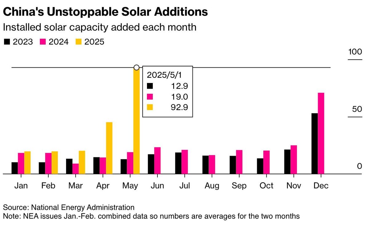 Китай установил больше солнечных мощностей за один месяц, чем любая другая страна за весь 2024 год. В мае в КНР установлено почти 93 ГВт солнечных панелей. Конкуренция производителей оборудования на внутреннем рынке толкает цены вниз, снижая рентабельность производства, но компенсирует новые правила, которые усложнили подключения малых СЭС к сети и отказ от гарантии цен на электроэнергию для производителей, которая гарантировала прибыль для солнечных проектов. В мае Китай также добавил 26 ГВт ветроэнергетики и 4,6 ТЭС.