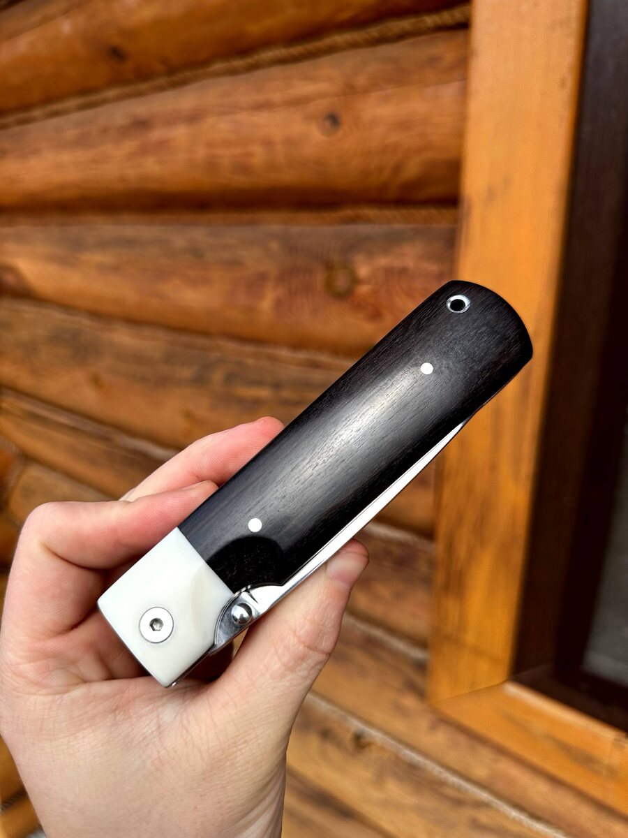 Складной нож «Севера» выполнен из стали х12мф с крио. С одной стороны полные спуски от обуха со следами ковки на клинке. С другой стороны выпуклая линза на клинках. Накладки на ноже выполнены из черного граба и акрила белого. Замок на ноже: Liner-lock. Нож заточен в бритва. Твердость клинка (HRC): 61-62 Цена за нож: 11.250 рублей, со скидкой: 9.562 рубля. В комплекте идут ножны из натуральной кожи. Можем сделать формованные ножны +8000 рублей. Для заказа писать на @Nazarklinokbot или по тел +79101343831 WhatsApp/Viber
