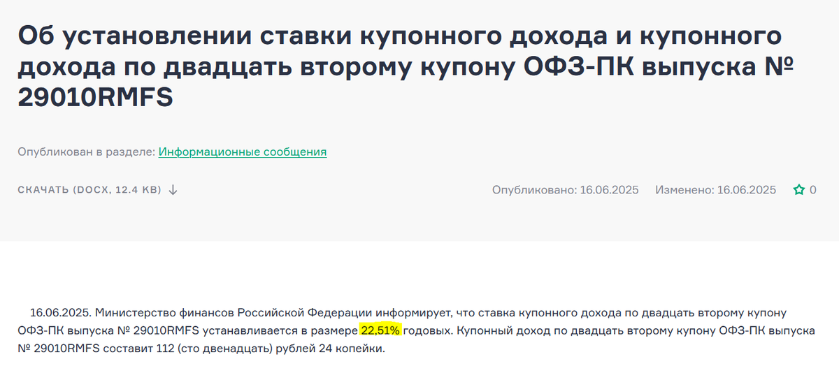 Неделю назад я давал расчет 22-го купона старосхемной ОФЗ Пк 29010 и прогнозную цену после объявления купона.