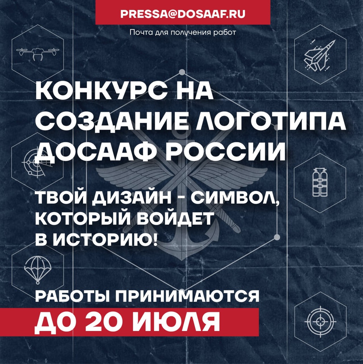 Конкурс на создание логотипа ДОСААФ России! ДОСААФ России объявляет конкурс на разработку имиджевого логотипа оборонного общества, который воплотит ценности организации: единство, силу и патриотизм. Победивший дизайн станет еще одним стильным современным визуальным символом ДОСААФ, сочетающим в себе традиции и новые тренды, и будет использоваться на сувенирной продукции, в социальных сетях и других коммуникациях ДОСААФ. Действующий логотип сохраняет статус официального и будет также использоваться на мероприятиях ДОСААФ. Требования к работам: • Оригинальность и узнаваемость; • Соответствие ценностям ДОСААФ: патриотизм, подготовка защитников Отечества, развитие технических и военно-прикладных видов спорта; • Гармоничное сочетание традиций и современного дизайна; • Адаптивность для печати и цифрового использования (векторный формат AI/EPS/SVG или в высоком разрешении PNG/JPG, 300 DPI). Условия участия: • Отправить дизайн на почту pressa@dosaaf.ru с темой письма «Логотип», указав ФИ