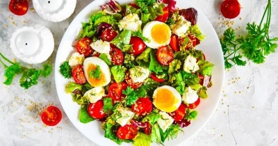 Ингредиенты: Листья салата - 600 гр. Помидоры - 400 гр. Яйца варёные - 2 шт. Творожный сыр - 300 гр. Оливковое масло - 6 ст. л. Лимонный сок - 2 ст. л. Чеснок - 4 зуб. Перец чёрный молотый Соль Кунжут Приготовление: Обжарить кунжут на сухой сковороде до золотистого цвета. Помидоры нарезать дольками. Зелень помыть, просушить. Яйца нарезать кружочками. Смешать оливковое масло, лимонный сок, чеснок (выдавить через пресс), соль и перец. На блюдо разложить зелень. Сверху помидоры, яйца. Творожный сыр небольшими порциями добавить в салат. Полить салат заправкой и посыпать кунжутом. Приятного аппетита! jx9oa7rp0ykpvfgd