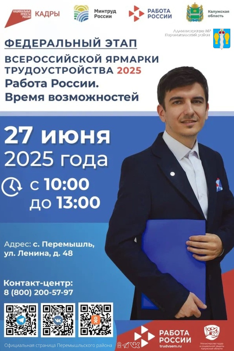 Работа России. Время возможностей. 27 июня в Перемышле состоится Всероссийская ярмарка трудоустройства – 2025. ⏰ Время: 10:00 – 13:00 📍 Место: с. Перемышль, ул. Ленина, д. 48 📞 Контактный центр: 8-800-200-57-97 Приходите – ваше будущее начинается здесь! #РаботаРоссии
